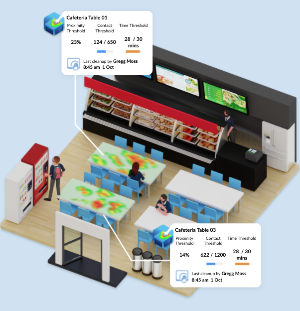 Vision AI solution SAMi tracks hand-to-surface data and sends alerts to cleaning teams when contact thresholds are reached to comply with safety mandates. This helps ensure surfaces of chairs, desks, cafeteria tables, and other high-touch areas are safe for students and staff to use.