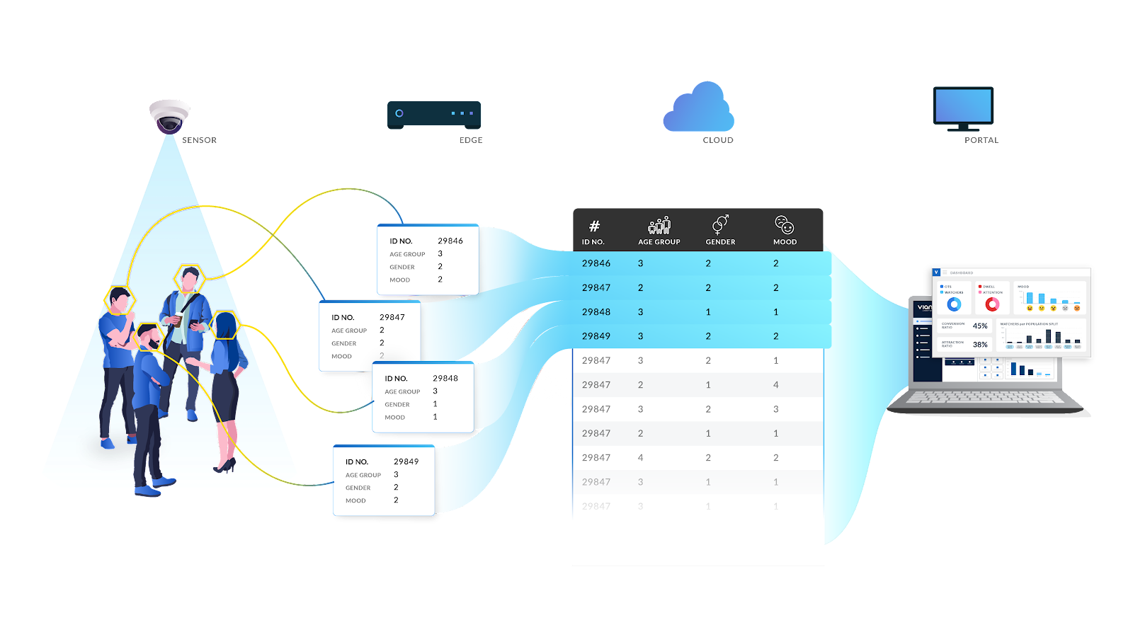 Viana™'s vision AI technology captures anonymous visual data through high-performance mapping and detection of faces, objects, and surfaces. In compliance with GDPR, Viana™ anonymizes personal and private data from its database by converting all human data to metric data, so no identifiable information is captured.